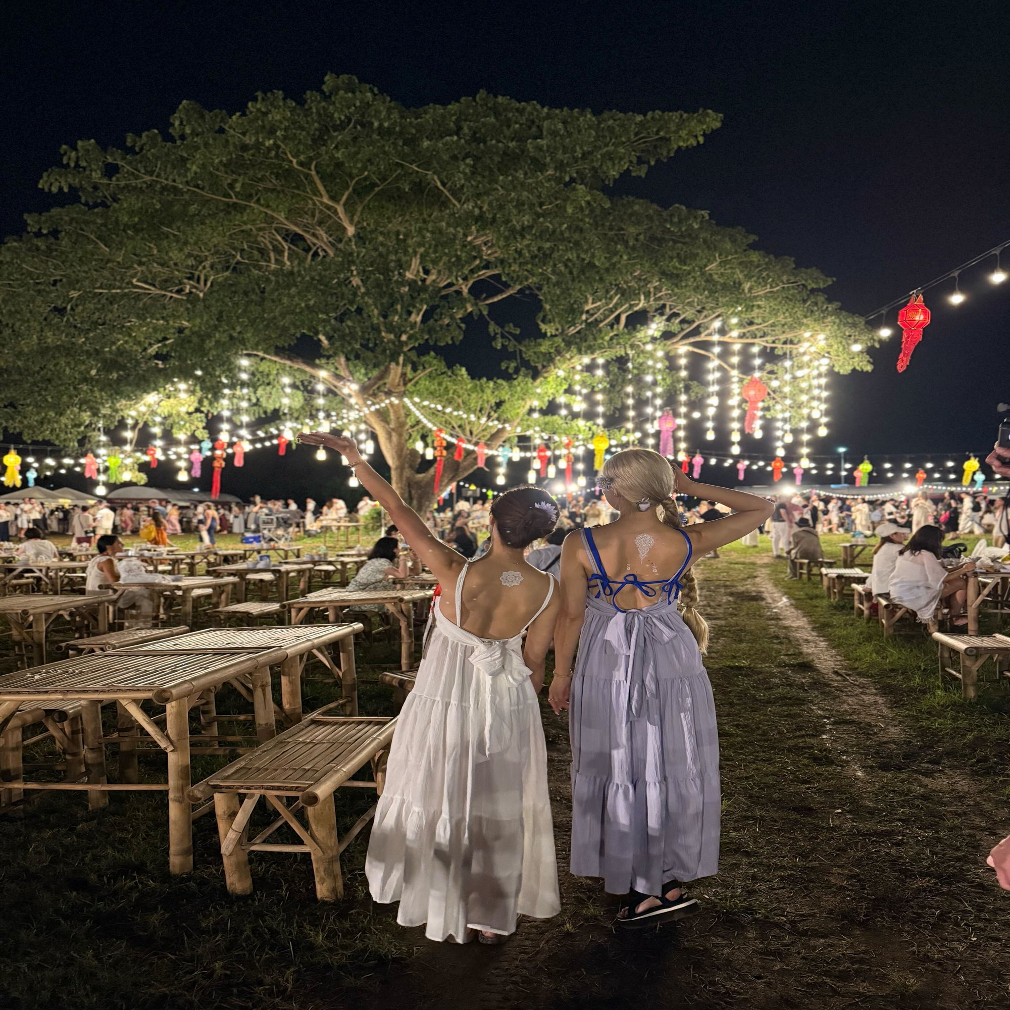 日中の汗と夜の冷房、どちらにも対応できる「軽くて重ねやすい服装」がベスト。私はコムローイにShienで買ったワンピースと、髪の毛のお花とか買って持って行きました。下が芝生なので、厚めのサンダルか、スニーカーをお勧めします。